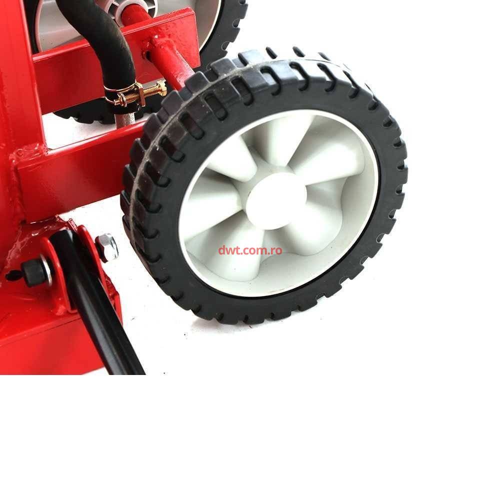 Este echipat cu un kit de roti si un maner robust si sigur