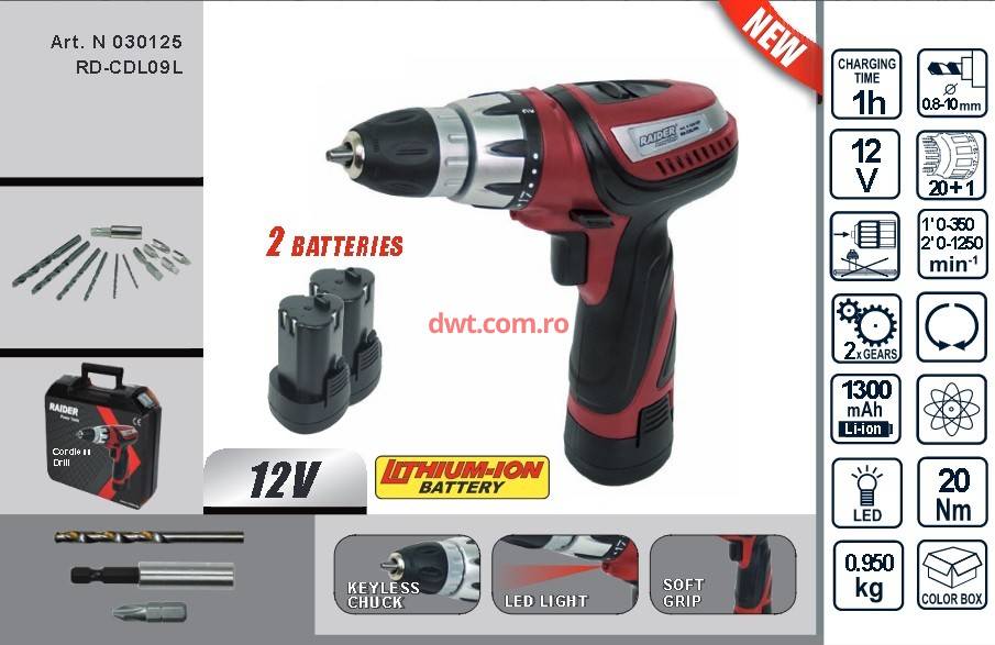 Bormasina cu acumulator, 2 baterii, 12V, Li-Ion, Raider RD-CDL09L |