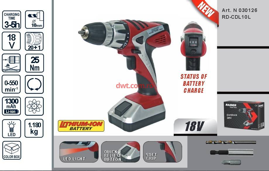 Bormasina cu acumulator Lithium-Ion, 18V, Raider RD-CDL10L |