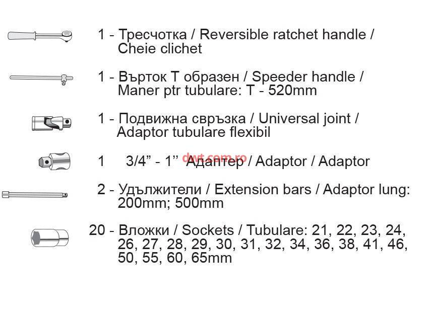 Set tubulare 26pcs 3/4" 21-65mm Gadget Setul este compus din 26 de piese Componenta trusei se poate vizualiza in FOTO 2 Pentru comenzi mai mari va rugam sa ne contactati pentru oferta personalizata. |