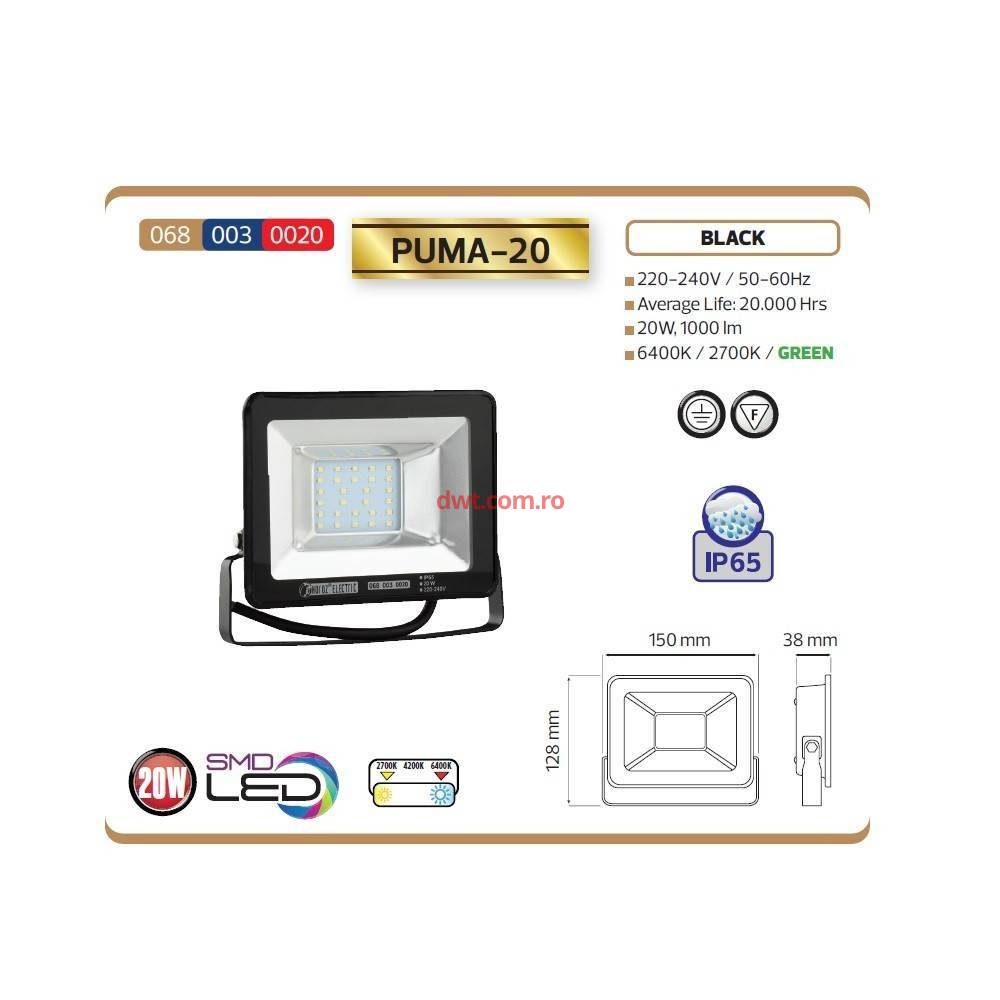 Horoz 068-003-0020/6400k Proiector Led Puma-20, putere 20 W, 1000 lm, IP 65 |