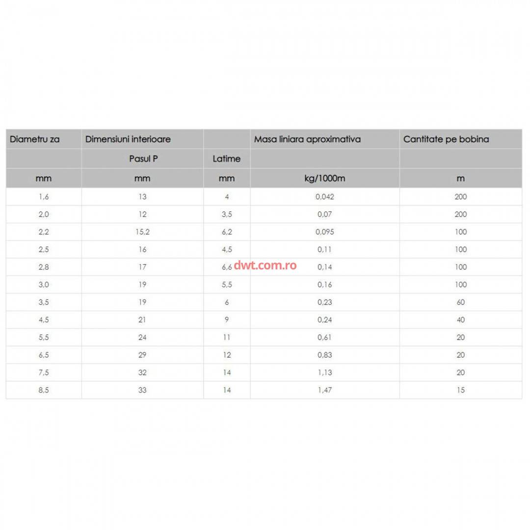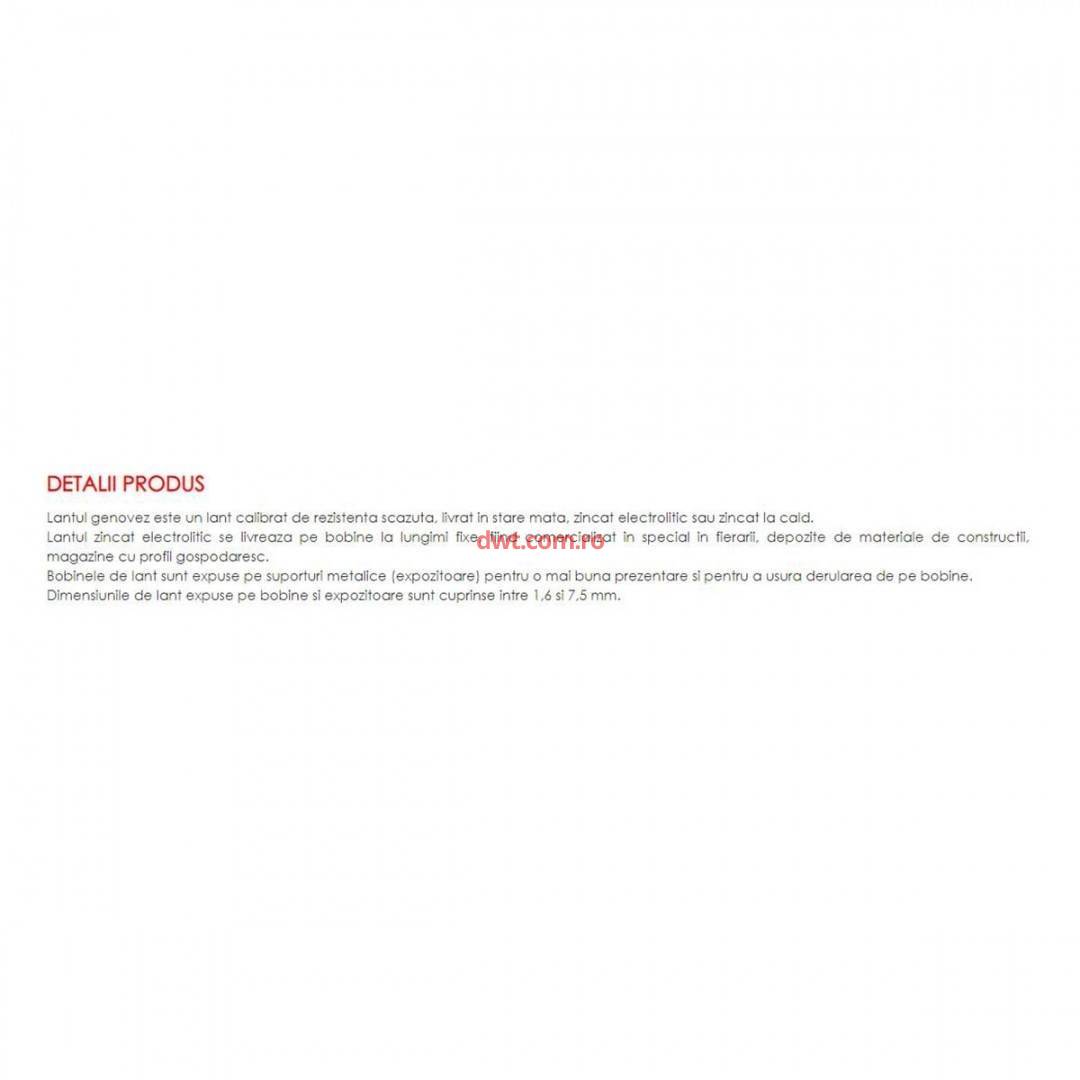 Brand: Micul Fermier Diametru za: 3 mm Dimensiuni intrioare pas P: 19 mm Lungime: 100 m Masa liniara aprox kg 1000m: 0.16 Tip produs: Lant zincat genovez |