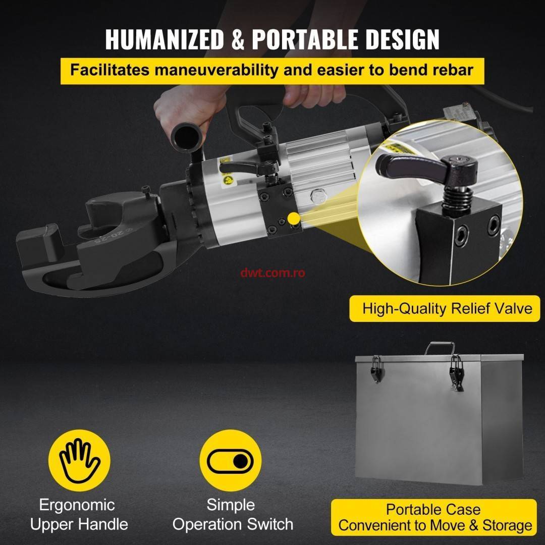 Masina hidraulica de indoit armatura otel, 1500 W, Unghi 0°-90°, Diametru de indoire 10-25 mm, 560 x 170 x 220 mm Indoire precisa si rapida: masina de indoit electric hidraulic poate indoi cu precizie barele solide in 4 secunde, cu unghiuri de indoire reglabile de la 0° la 90°. Alimentat de un motor din cupru pur de 1500 W pentru performante robuste. Cutie de scule din metal inclusa: Vine cu o cutie de scule de depozitare rezistenta la coliziuni, care gazduieste masina si diverse unelte, facandu-l usor de transportat si utilizat in diferite locatii. Gama larga de indoire: Potrivit pentru indoirea barelor de armare cu diametre de la 10 la 25 mm. Se ocupa cu usurinta de diferite necesitati de indoire, potrivit pentru bara de armare cu carbon mediu, carbon scazut, rotund si filetat. Constructie usoara: Fabricat din PVC usor, conceput pentru confort in timpul utilizarii prelungite. Greutatea compacta si manevrabila minimizeaza oboseala chiar si in timpul functionarii prelungite. Indoire de inalta rezistenta: carligele imbunatatite de inalta rezistenta asigura performante de indoire pe termen lung. Echipat cu un buton de resetare; pur si simplu trageti de supapa hidraulica pentru a reseta in siguranta dupa indoire. Dimensiuni produs: 560 x 170 x 220 mm Culoare: negru Greutate 22,94 kg (inclusiv toate accesoriile) Putere nominala: 1500W Materiale principale: fonta (cap), aluminiu de calitate pentru aviatie (corp pompe), aluminiu (carcasa masinii) Diametru de legare: 0,39-0,98 ± 0,02 inchi / 10-25 ± 0,5 mm |