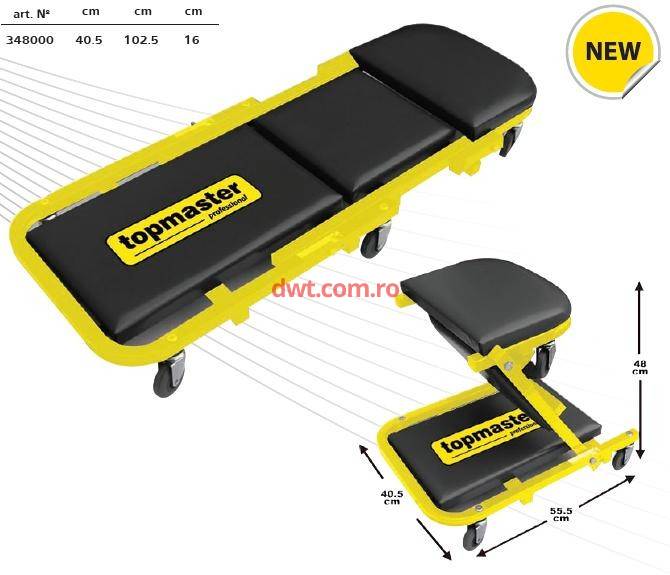 TopMaster Bulgaria Caracteristici tehnice: Cod produs: 348000 Pat/scaun mobil pe roti pentru lucrari de mecanica auto Dimensiuni pat 405 x 1205 x 116 mm Dimensiuni scaun 405 x 555 x 480 mm scaun Fixat pe 6 roti. Sarcina maxima 150 kg Inaltimea minima 16 cm Inaltimea maxima 48 cm