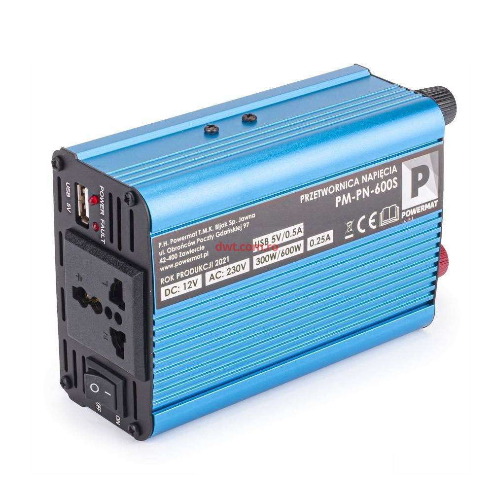Comanda instant - Powermat PM1058 Invertor cu unda sinusoidala modificata 12V, 230V, 300/600 W, port USB