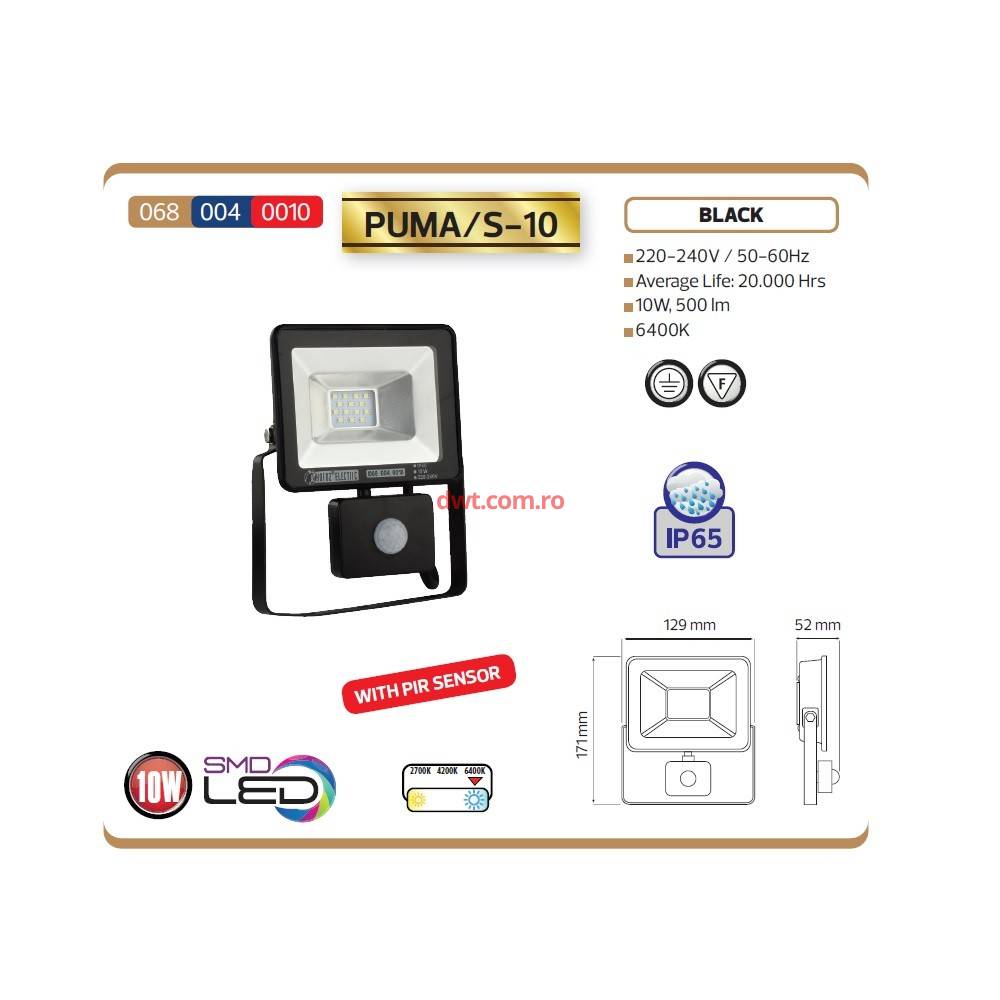 Proiector Led cu senzor Puma/S-10, putere 10 W, 500 lm, IP 65 |