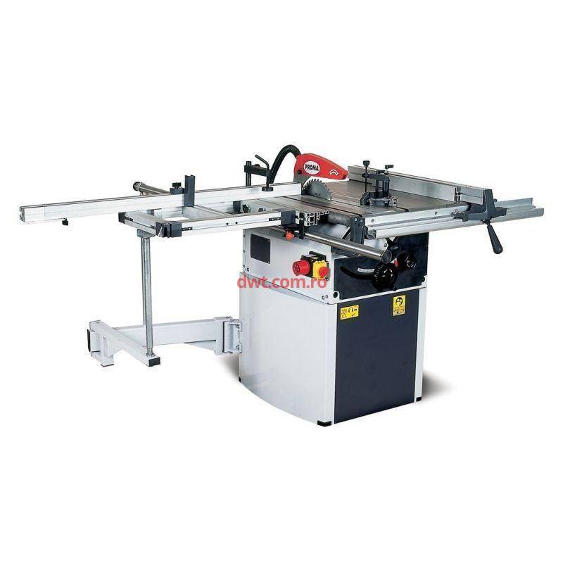 PROMA-CEHIA POSIBILITATE DE FINANTARE – TRANSPORT GRATUIT Caracteristici tehnice: Fierastraiele circulare sunt utilizate pentru taierea longitudinala şi transversala a materialului lemnos.Ofera posibilitatea reglarii unghiului şi a adancimii de taiere, Aavand o productivitate mare. Constructia rigida absoarbe vibrațiile în timpul funcționarii. Tensiune 3/ PE AC 400 V, 50 Hz Putere utila motor 2200 W Curent 6,25 A Protectie motor IP 54 Dimensiuni panza 254 × 30 × 3 mm Diametru pretaietor 220 mm Turatia panza 4000 rot/min Inaltime de lucru 900 mm Dimensiuni masa 800 x 840 mm Dimensiuni masa mobila 710 x 410 mm Cursa masa 1590 mm Deplasare rigla 2 200 mm Grosimea maxima de taiere la 90°- 80 mm Grosimea maxima de taiere la 45°- 42 mm Reglarea unghiului de taiere 0-45° Reglarea unghiului de inclinare a riglei de ghidare +/- 45° Diametru ax 30 mm Dimensiuni utilaj 2250x2020x1100 mm Greutate 185 kg Accesorii standard: Panza circulara in dotare standard Reglarea adancimii şi unghiului de taiere - standard Sanie pe ghidaje cu bile - standard Accesorii optionale: Panza circulara SK 254 x 30 x 3 (36 z) cod produs 25000254 Panza circulara în dotare