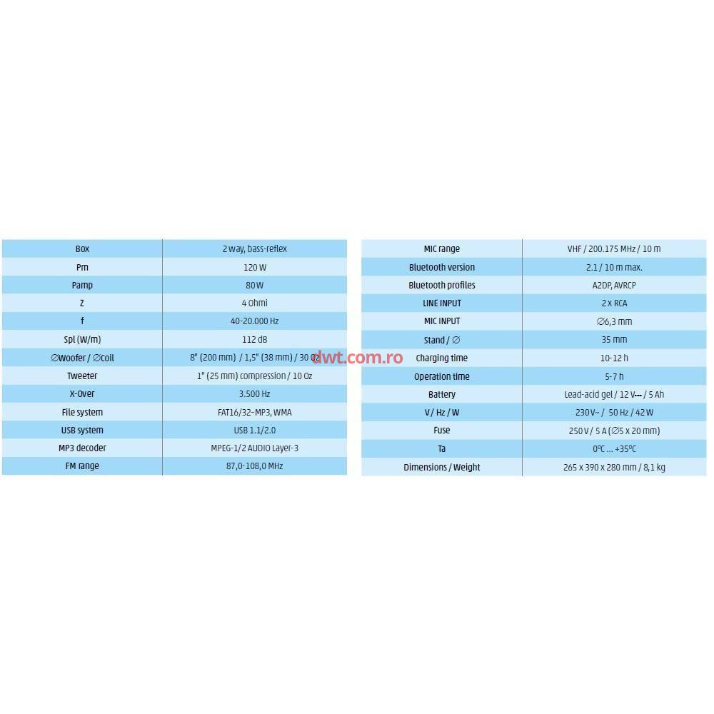 • intrări: USB/SD, MIC, WIRELESS MIC, LINE