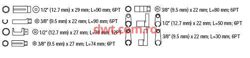 Caracteristici tehnice: Dimensiuni [mm] 12.7x29, 9.5x22, 12.7x27, 9.5x27, 9.5x22, 12.7x22, 9.5x22 Prindere 1/2" 3/8" Materiale CrMo SCM-440, CrV50BV30 Greutate(kg) 2.2000 Set compus din 7 chei |