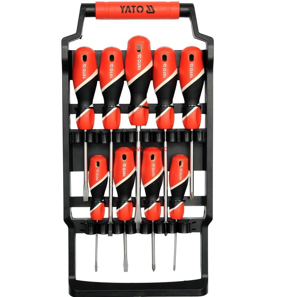 Caracteristici tehnice: Surubelnite profesionale realizate din oțel cu simbolul S2, călit până la aproximativ 58 HRC. Finisaj satinat, bitul călit și sablată. Mânerul este fabricat din material solid pentru durabilitate. Cap magnetic Set compus din 9 surubelnite |