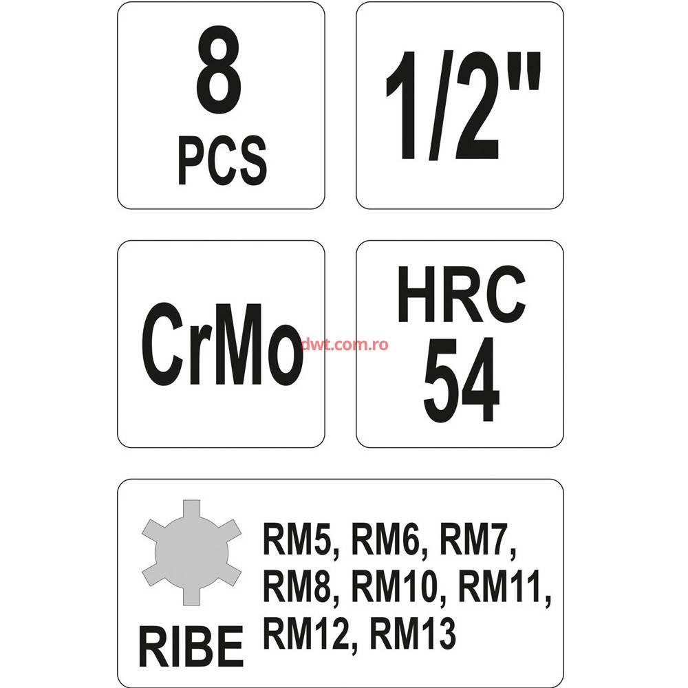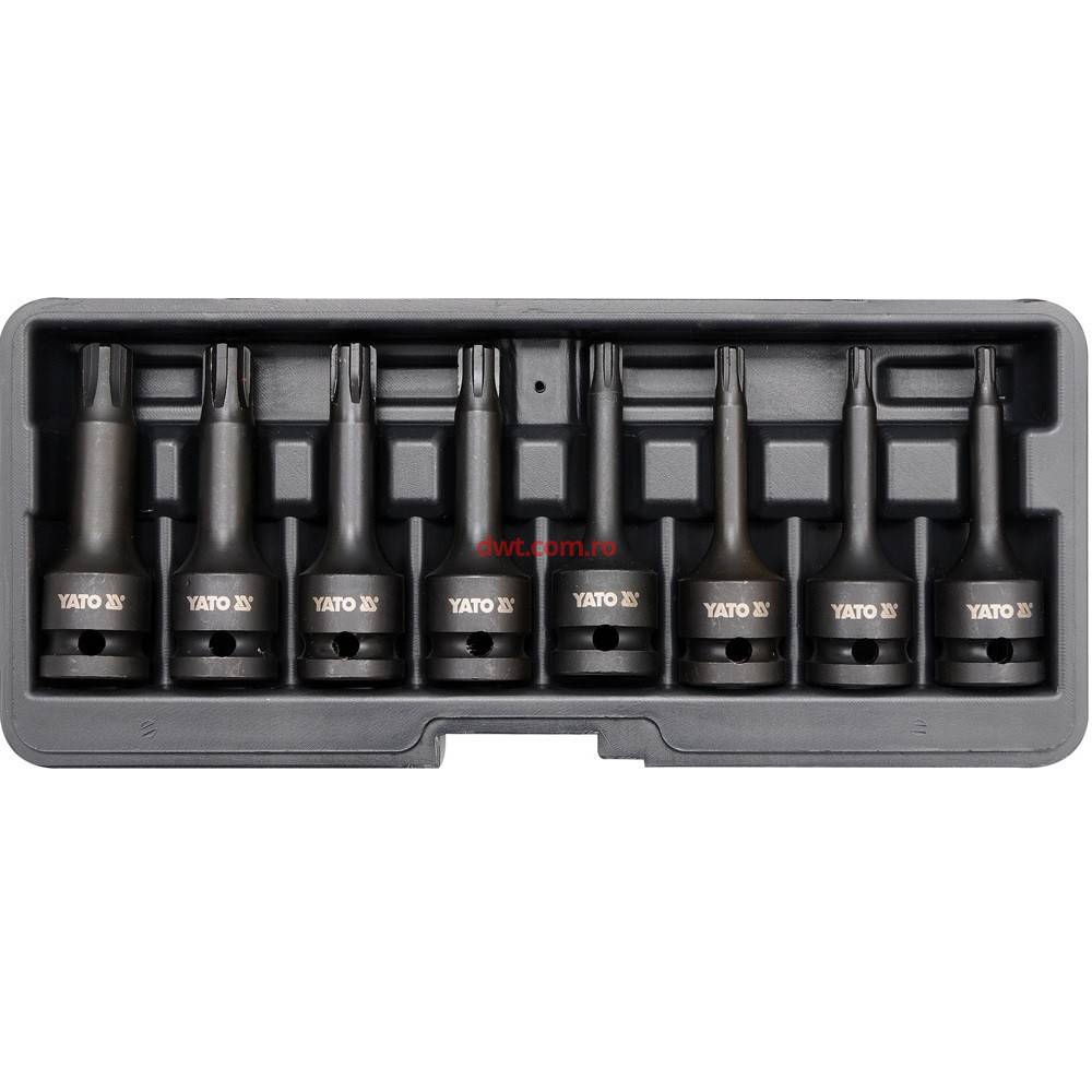YATO Made in Poland Caracteristici tehnice: Prize cu sistem AS-Drive, cresterea cuplul maxim cu 25%, Servicii de montaj si corective, garaje si ateliere de lucru profesionale SET CHEI IMPACT, 8 BUC, RIBE RM5-RM13, 1/2"12.5 mm