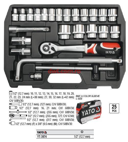 YATO Made in Poland Caracteristici tehnice: Prize cu sistem AS-Drive, cresterea cuplul maxim cu 25% Servicii de montaj si corective, garaje si ateliere de lucru profesionale Material Crom Vanadium SET CHEI TUBULARE+ANTRENOR 25 BUC, 1/2"10-32mm
