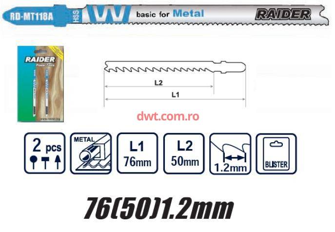 Raider Bulgaria Caracteristici tehnice: Set de doua panze pentru taierea metalului. Lungime utila 50 mm L2 Distanta intre dinti 1.2 mm |