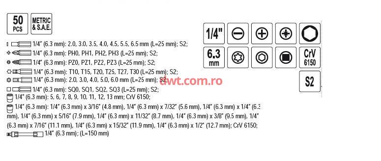 YATO Made in Poland Caracteristici tehnice: Servicii de montaj si corective, garaje si ateliere de lucru profesionale SET SURUBELNITA FLEXIBILA+BITI+TUBULARE50 BUC/SET