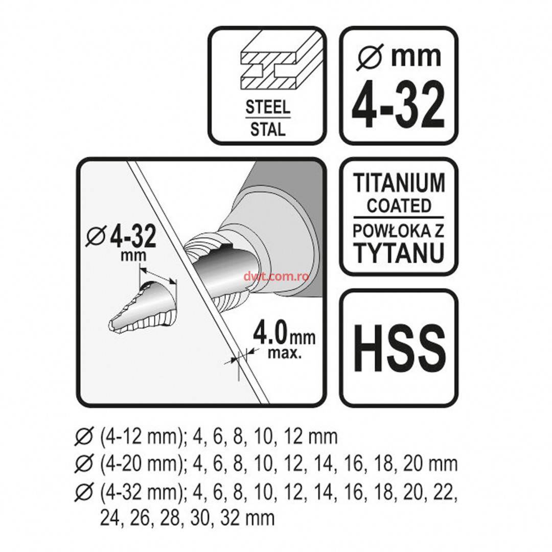 Set 3 burghie in trepte Sthor 22616, dimensiune 4-32 mm Caracteristici tehnice: Un set de 3 burghie in trepte STHOR 22616. Conceput pentru găurirea din oțel inoxidabil de înaltă calitate, oțel structural și laminat la rece, în metale neferoase, foi de oțel, materiale plastice. Marginile găurii găsite rămân curate și fără bavuri Burghiul nu aluneca pe suprafețele rotunde Autocentrare pe suprafețe rotunjite și alunecoase Disipare rapidă a căldurii la găurirea în materiale dure Material din oțel HSS de mare viteză acoperit cu nitrură de titan Dimensiune cuprinsa intre 4-32 mm, gradate în trepte de 2 și 3 mm. Prindere cilindrica |