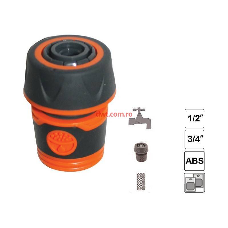 TopGarden Bulgaria Caracteristici tehnice: Cod produs: 380980 Conexiune rapida si usoara la sursele de apa Decuplare prin tragere usoara Material din plastic ABS de duritate sporita Dimensiune 1/2” Lungime 12.7 mm Greutate 40 g Culoare gri/portocaliu |