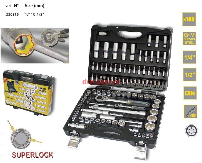 TopMaster Bulgaria Caracteristici tehnice: Cod produs: 330316 Trusa 108 tubulare TOPMASTER Cea mai buna calitate dovedita chiar de materialul din care sunt fabricate, acesta fiind unul de o rezistenta foarte mare. Accesorii ambalate in cutie din plastic, pentru o protectie sporita atunci cand nu sunt folosite. Contine : 17 buc 1/2" tubulare : 10, 11, 12, 13, 14, 15, 16, 17, 18, 19, 20, 21, 22, 24,27, 30, 32 mm 5 buc 1/2" DR. tubulare cruce dubla : E10, E11, E12, E14, E16, E18, E20, E24 2 buc 1/2" DR. tubulara pentru bujii :1/2" DR. x 16, 21 mm Adaptor lung : 1/2" DR. 125, 250 mm Adaptor tubulare flexibil : 1/2 DR. Adaptor 1/2" DR. Cheie clichet 72 sau 48 dinti : 1/2" DR. x 250 mm 16 buc 5/16" x 30 mm Biti ,PH 3, PH4, Hex :7, 8, 10, 12, 14 mm , Dreapta : 8, 10, 12 mm, PZ3, PZ4, T40, T45, T50, T55 mm Imbus: 1/2" DR. x 5/16"
