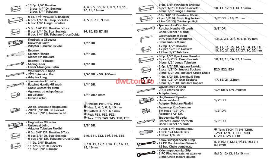 FABRICATA IN TAIWAN Caracteristici tehnice: Cod produs: 339107 Valiza pentru transport din material rezistent Balamale din otel Material Cr-V, cleme de metal Componenta trusa: 13 buc 1/4†Tubulare: 4, 4.5, 5, 5.5, 6, 7, 8, 9, 10, 11, 12, 13, 14 mm 6 buc 1/4†Tubulare Lungi: 4, 5, 6, 7, 8, 9 mm 5 buc 1/4†DR. Tubulare Cruce Dubla: E4, E5, E6, E7, E8 Adaptor Tubulare Flexibil 1/4†DR. Maner ptr Tubulare 1/4†DR. Levier Strangere Satin 1/4†DR. Adaptor Lung 1/4†DR. x50, 100mm Cheie Clichet 45 dintii 1/4†DR. Imbus Furtun 1/4†DR./ 8mm 20 buc 3/8†Tubulare cu bit Phillips: PH1, PH2, PH3 Hex: 3, 4, 5, 6, 8, 10 mm Torx: T30, T40, T45, T50, T55 Adaptor Tubulare Flexibil 3/8†DR. 6 buc 3/8†DR. Tubulare Cruce Dubla: E10, E11, E12, E14, E16, E18 11 buc 3/8†Tubulare: 9, 10, 11, 12, 13, 14, 15, 16, 17, 18, 19mm 6 buc 3/8†Lunga Tubulare: 10, 11, 12, 13, 14, 15 mm 2 Buc 3/8†DR. Tubulara ptr Bujii 3/8†DR. x16, 21 mm Cheie Clichet 45 dintii 3/8†DR. 9 buc Imbus Maner: 1.5, 2, 2.5, 3, 4, 5, 6, 8, 10 mm 17 buc 1/2†Tubulare: 10, 11, 12, 13, 14, 15, 16, 17, 18, 19, 20, 21, 22, 24, 27, 30, 32 mm 6 buc 1/2†Lunga Tubulare: 10, 12, 13, 14, 17, 19 mm 3 buc 1/2†DR. Tubulare Cruce Dubla: E20, E22, E24 4 buc 1/2†DR. Tubulare Impact: 17, 19, 21, 23mm Adaptor Lung 1/2†DR. x125, 250mm Adaptor Tubulare Flexibil 1/2†DR. Adaptor 1/2†DR. Cheie Clichet 45 dintii 1/2†DR. 10 Buc 1/4 Biti Torx: T10H, T15H, T20H, T25H, T27H, T30H, T40H, ST20, ST25, ST30 12 buc Cheie combinata: 8, 9,10,11,12,13,14,15,16,17,18,19mm 3 buc Cheie inelare double: 8x10, 12x13, 17x19 mm Detalii vezi FOTO |