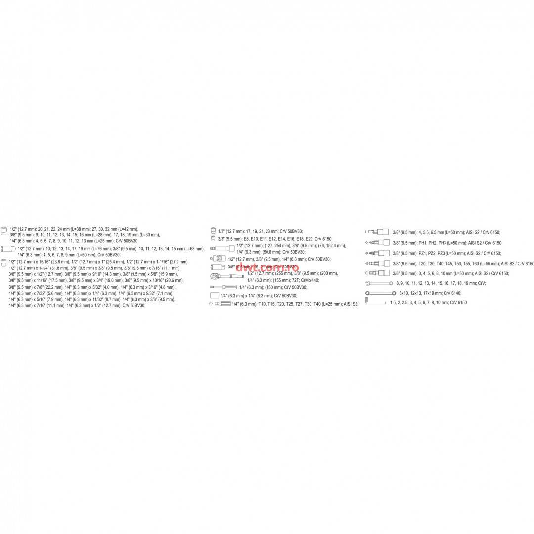 Trusa de scule profesionala, care a fost dezvoltata pentru nevoile serviciilor specializate pentru service-uri. Cheile tubulare și antrenoarele au fost realizate din oțel durabil. Kit-ul include, de asemenea, biți din oțel S2 dur. Acest kit de lucru permite lucrul cu sarcini foarte mari și precizie si vă permite să efectuați mai multe activități de servicii legate de slăbirea și strângerea conexiunilor filetate de diferite dimensiuni nominale. Componenta: 1/2 "20; 21; 22; 24 mm, L = 38 mm, 27, 30, 32 mm, L = 42 mm ½ "17; 19; 21; 23mm 1/2 "10; 12; 13; 14; 17; 19 mm, L = 76 mm 1/2 "inch: 15/16 '' 1 '' 1-1 / 16 '' 1-1 / 4" " 3/8 "9, 10; 11; 12; 13; 14; 15; 16 mm, L = 28 mm; 17; 18; 19 mm, L = 30 mm 3/8 "10; 11; 12; 13; 14; 15 mm, L = 63 mm 3/8 "inch: 3/8 '' 7/16 '' 1/2 '' 9/16 '' 5/8 '' 11/16 '' 3/4 ''; 13 / 16 "" 7.8 "" 3/8 "Torx: E8, E10, E11, E12, E14, E16, E18, E20 1/4 "prize 4, 5, 6, 7, 8, 9, 10, 11, 12, 13 mm, L = 25 mm 1/4 ": 4, 5, 6, 7, 8, 9 mm, L = 50 mm Prize de curent 1/4 "inch: 5/32 '' 3/16 '' 7/32 '' 1/4 '' 9/32 '' 5/16 '' 11/32 '' 3 / 8 "" 7/16 "" 2.1 ""; Clinchet 1/2 ": 72T, 255 mm Clinchet 3/8 ": 72T, 200 mm Clinchet 1/4 ": 72T, 155 mm biți Knob 1/4 ", 150 mm 1/2 extensie "127 mm 254 mm Extensie 3/8 "76 mm 152.4 mm Extensiile 1/4 ": 50.8 mm tubulare pentru bujii 3/8 ": 16; 21 mm universal comun: 1/2 ", 3/8 '' si 1/4 '' adaptor bit Bits 1/4 "Torx: T10, T15, T20, T25, T27, T30, T40 Torx șurubelniță pentru capac 3/8 ": T20, T30, T40, T45, T50, T55, T60 Philips șurubelniță în cruce pe cap 3/8 ": Ph1, Ph2 Ph3 Șurubelniță biți de cruce Pozidriv pe capac 3/8 ": PZ1, PZ2, PZ3 Șurubelniță biți de plat pe capac 3/8 ": 4, 5.5, 6.5 mm șurubelniță hexagonala pe capac 3/8 "3, 4, 5, 6, 8, 10 mm spanners: 8; entorse 9; 10; 11; 12; 13; 14; 15; 16; 17; 18; 19 mm Wrenches Ratchet: 8x10; 12x13; 17x19 mm chei Allen: 1.5; 2; 2.5; 3; 4; 5; 6; 7; 8; 10 mm Valiza transport |