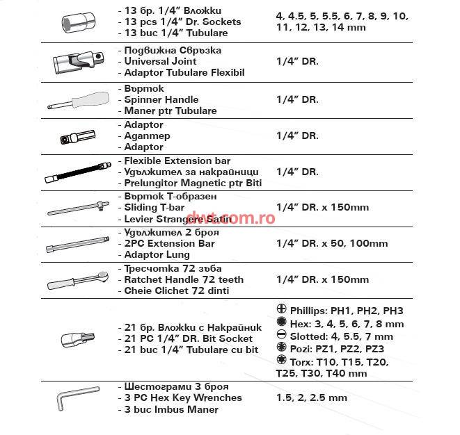 TopMaster Bulgaria Caracteristici tehnice: Cod produs: 339105 46Pcs/Trusa tubulare 1/4" 4-14mm Cr-V TMP 13 chei tubulare prindere 1/4" – 4-4.5-5-5.5-6-7-8-9-10-11-12-13-14 mm Cheie cu clichet prindere 1/4" – prindere/eliberare rapida, 48 dinti, maner 2 prelungitoare prindere 1/4" - 50 mm, 100 mm Maner in T culisant 1/4" Cuplaj cu articulatie cardanica prindere 1/4" Adaptor bit 8mm- 1/4" Biti pe tubulara purtatoare 21 buc: PH 3 buc, Hex 6 buc, Slotted 3 buc, Pozi 3 buc, Torx 6 buc Imbus "L" - 3 buc Gama Profesionala Greutate (Kg): 4 Material metal Cr-V |