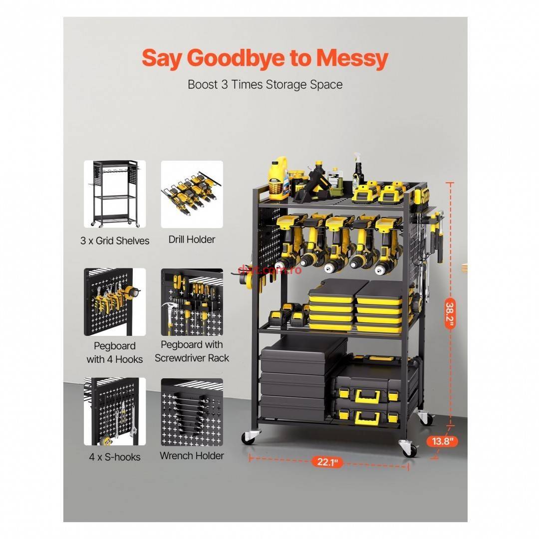 scule va ofera mult spatiu! Cu trei rafturi din plasa, un suport de burghiu cu
