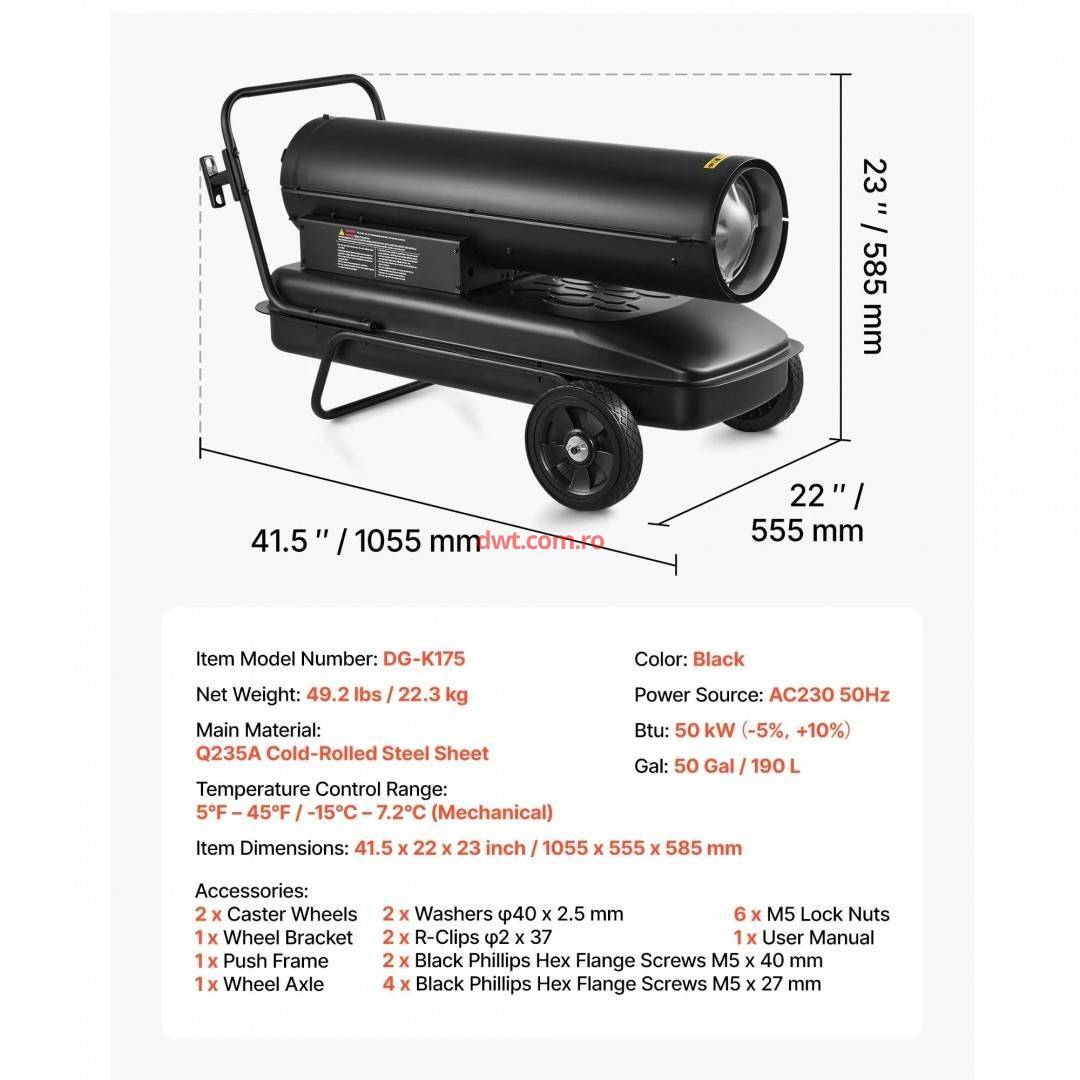 VivaTechnix GFSMYQNQ50KWRABDF001V2 Generator de aer cald, Diesel, 50 kW, 1020 mc/h, ardere directa, Rezervor 190 l, 1055 x 555 x 585 mm |