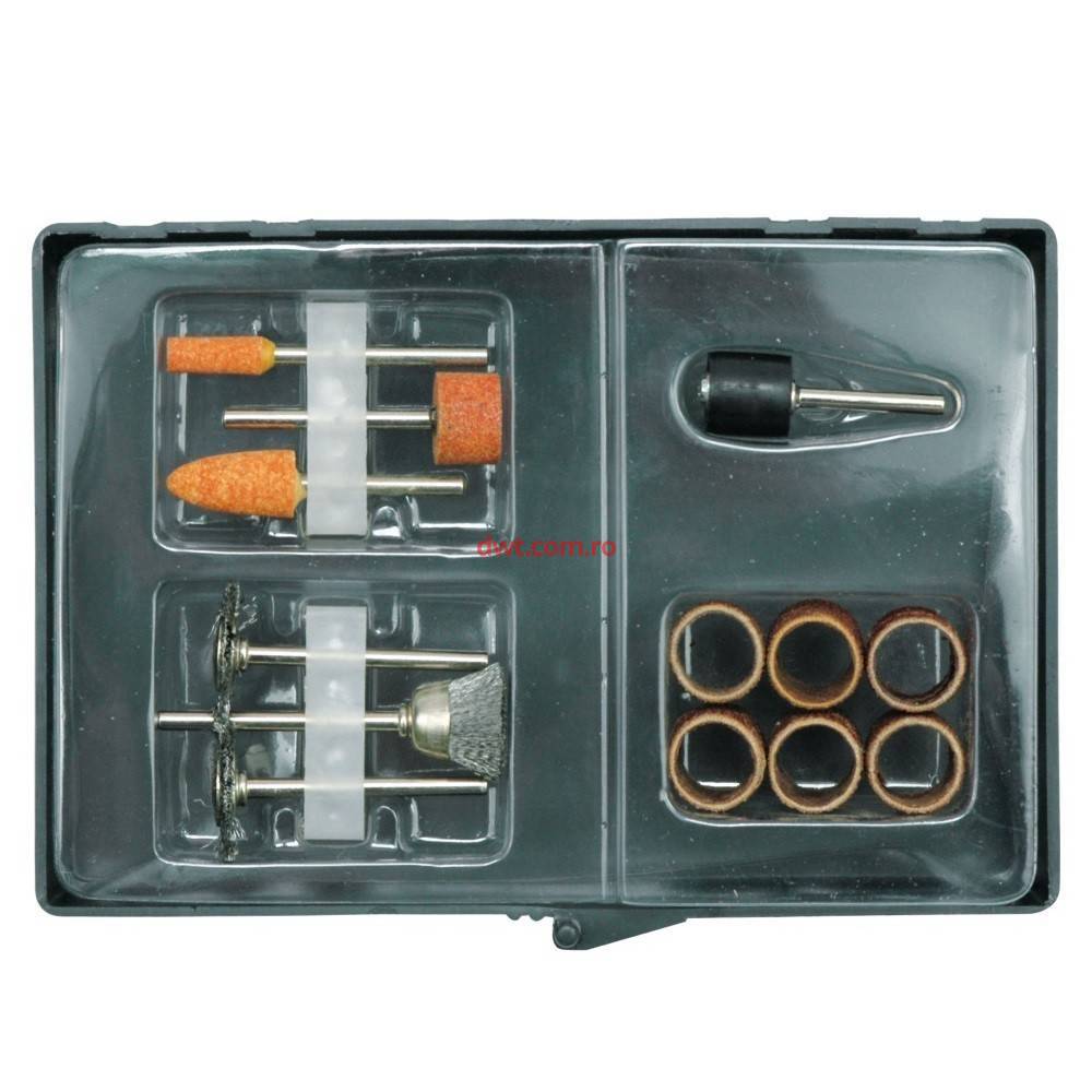Contine 3 pietre abrazive, 3 perii de sarma, 6 benzi