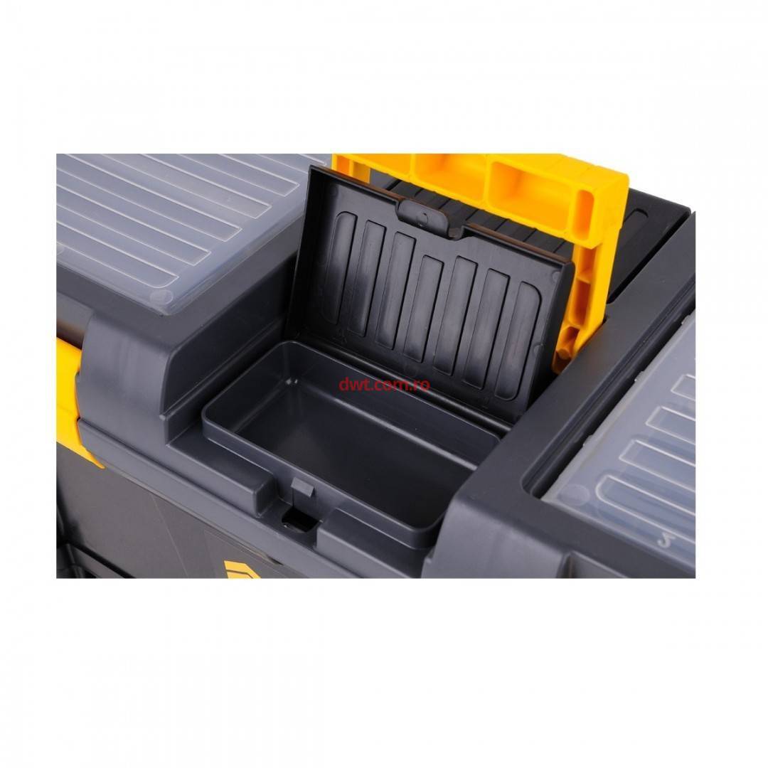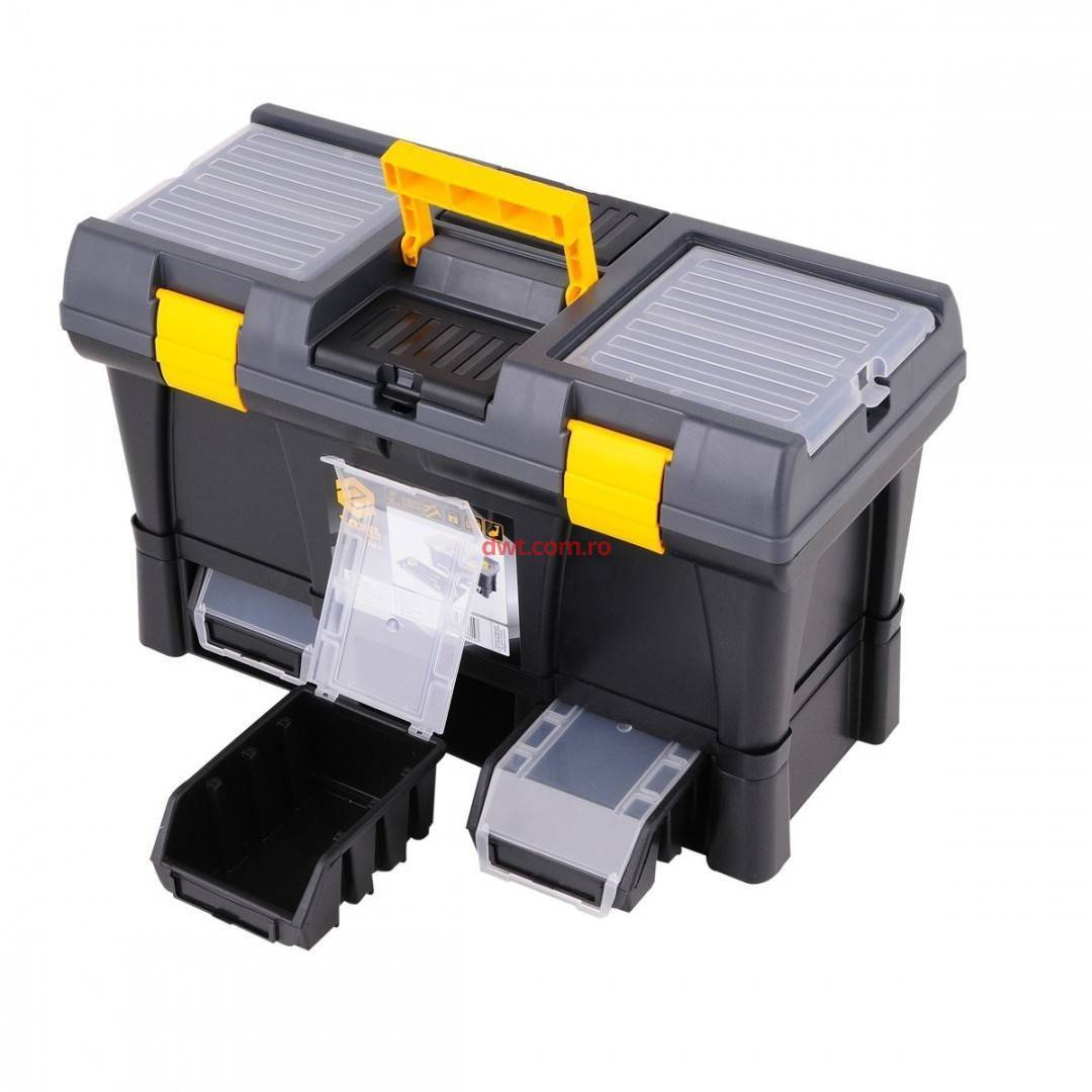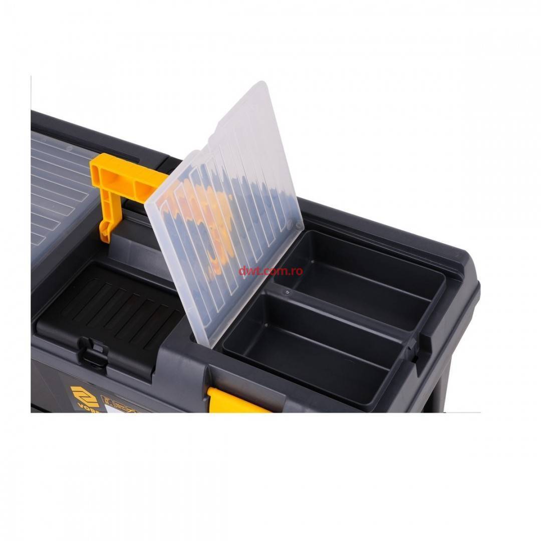 Caracteristici tehnice: Cutie de scule 20 ", modul cu 3 compartimente de depozitare. Dimensiuni 52,5x25,6x32,5 cm. Capacitatea de încărcare este un maxim de cutie 25 kg și module suplimentare 3 kg. Cutia din partea superioară a capacului are un organizator. Cutiile laterale au mânere convenabile prin transfer în mijloc se poate scoate tava. In partea de jos modul cu 3 compartimente de depozitare 78831 tip S dimensiune 116x161x75mm fiecare. |