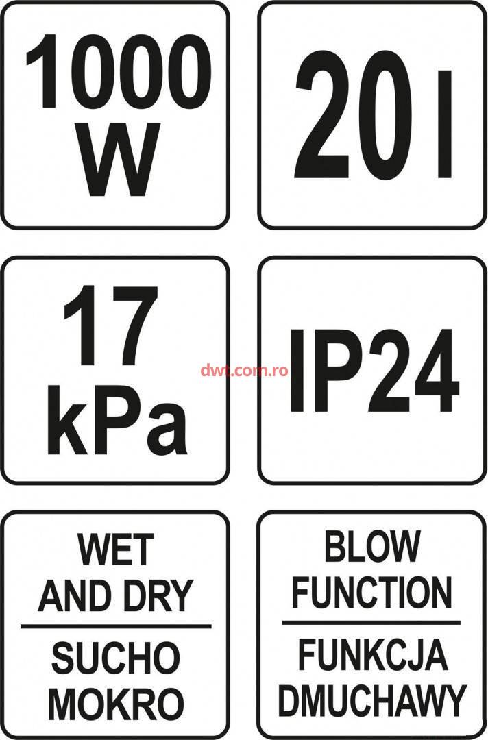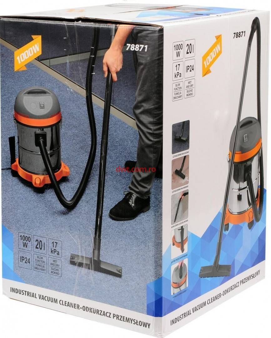 Caracteristici tehnice: Puterea motorului de 800W (max 1000W.), Rezervor din oțel inoxidabil, cu o capacitate 20L, Baza rezervorului pe roți, cu locuri pentru a stoca accesorii aspirator, funcția de suflante de frunze, Sistem de filtrare în mai multe etape Filtru de spumă și materialul de filtrare, domeniu de lucru de până la 7m, furtun flexibil de aspirare, cu o lungime de aprox 2m, două piese de plastic țeavă, cu o lungime de aproximativ 1 m, duza de podea largă, duză pentru spații înguste, Cablu de alimentare cca. 5 m, Clasa de protectie IP 24 Putere: 1Kw Tensiune: 230 V Capacitate rezervor: 20 L Lungime furtun: 2 m Greutate: 10 Kg