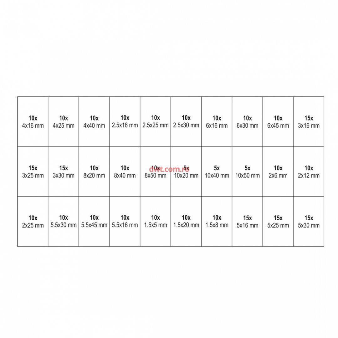 mm, 3×30 mm, 4×16 mm, 4×25 mm, 4×40 mm, 5×16 mm, 5×25 mm, 5×30 mm, 5,5×16 mm,