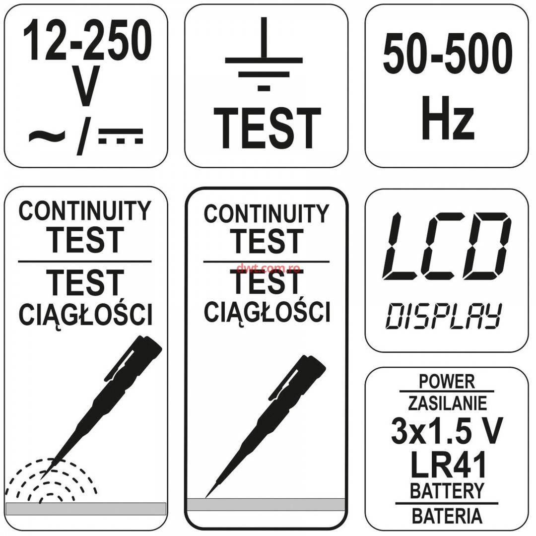 YATO YT-28630 Tester de tensiune digital Yato YT-28630, Semnalizare Led, 12-250 V |