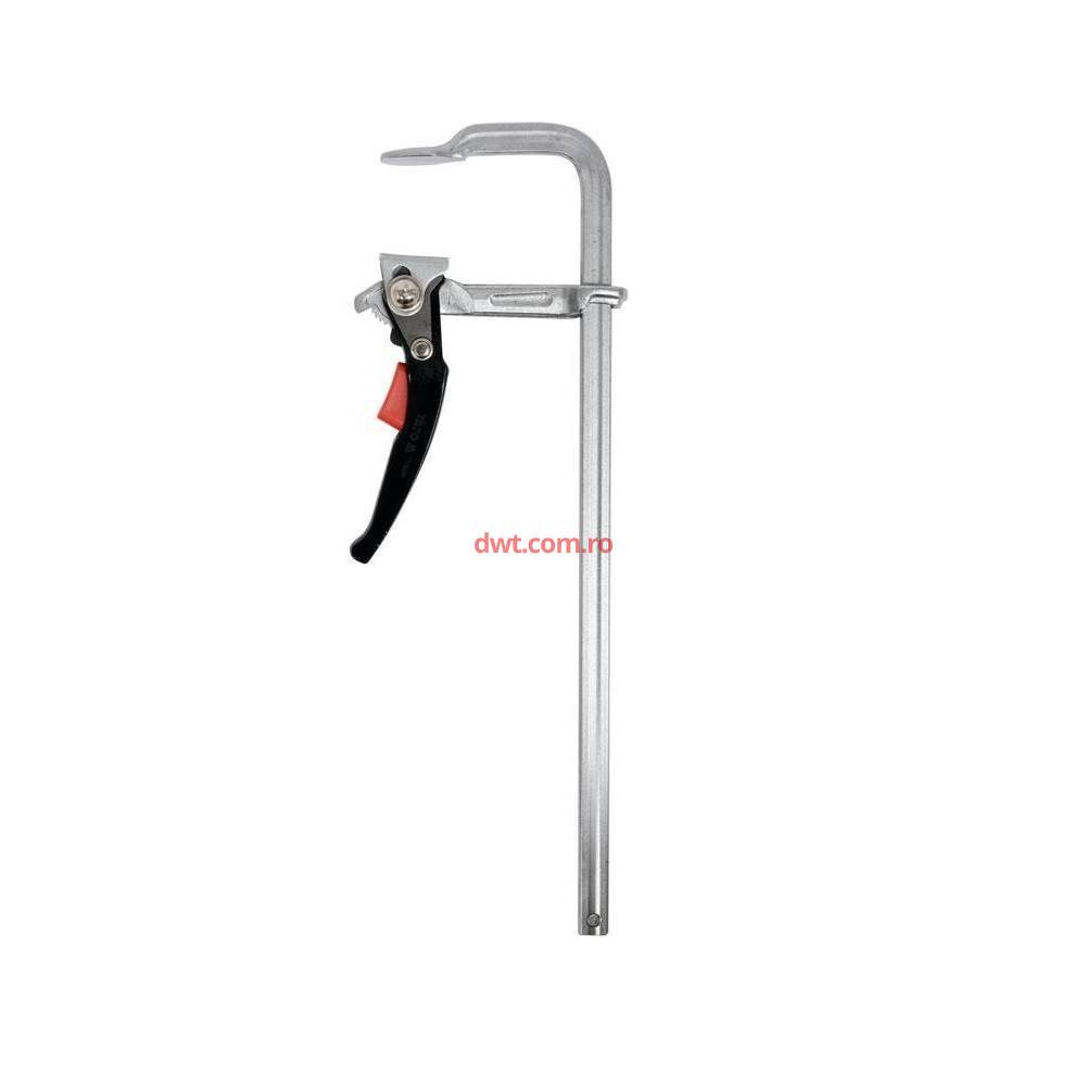 Clema cu mecanism de prindere cu clichet Aceasta garanteaza o presiune foarte puternica a falcilor Constructia din otel asigura o fixare rapida si stabila, rezistenta la torsiune si vibratii Ghidajul forjat, profilat, impreuna cu mecanismul cu clichet asigura o distributie eficienta Pentru fixarea rapida si precisa a materialelor Fixati falcile pe material si apasati maneta ferm Deblocarea se face apasand pe buton Dimensiune falci: 400 x 100 mm Greutate: 1.3 Kg |