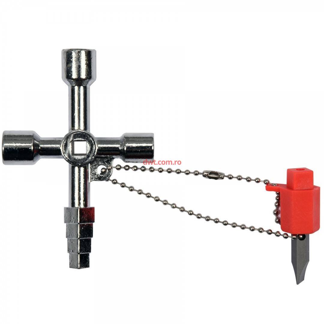 O cheie cu patru brate, conceputa pentru deschiderea si inchiderea incuietorilor din dulapuri tehnice, de exemplu cu gaz, electricitate, apometre, aer conditionat, dispozitive de ventilatie etc. Fabricat din aliaj de zinc si aluminiu, asa-numita zamac.