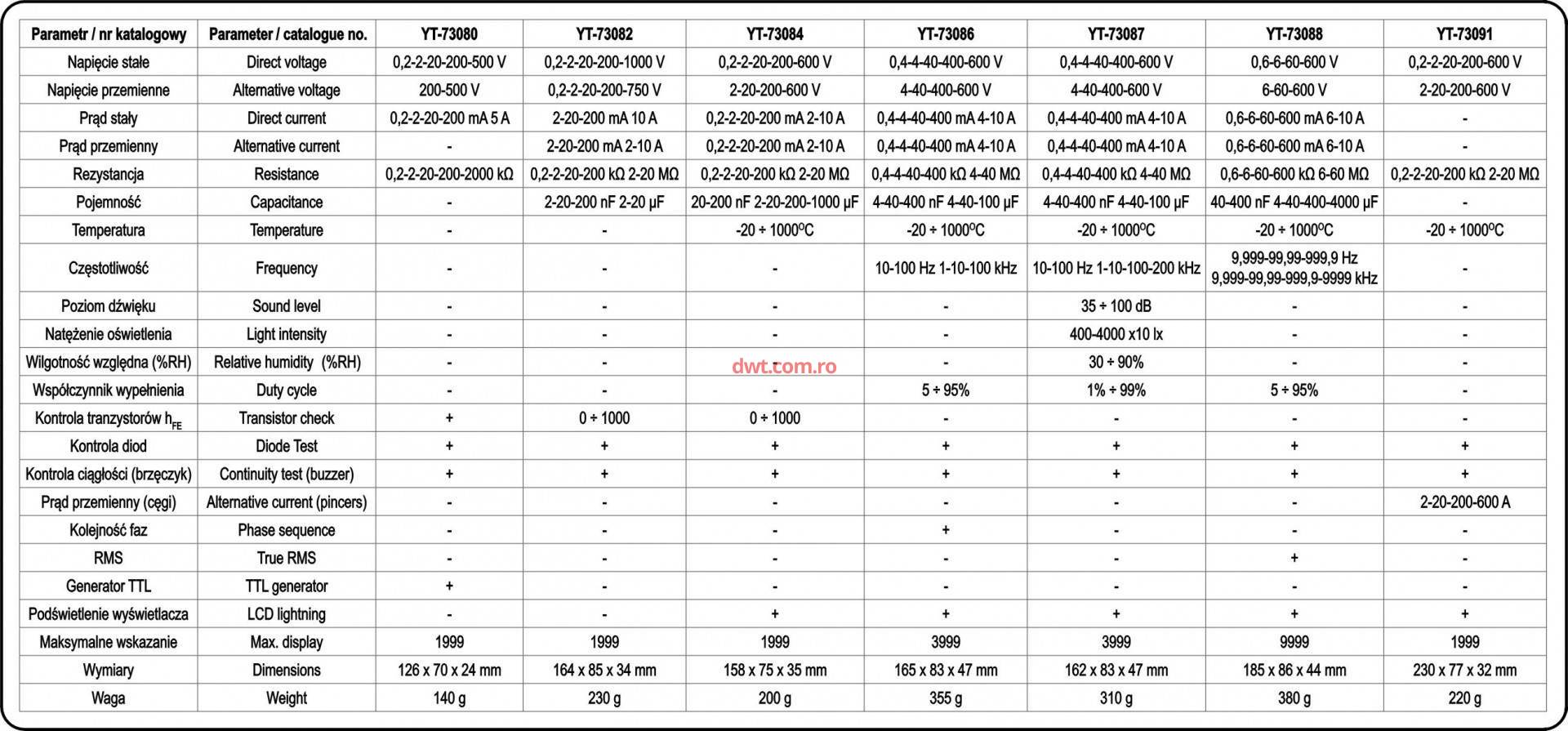 Caracteristici tehnice: Multimetru (masura electrice) YT-73086 poate măsura DC sau tensiune de curent alternativ, DC sau AC, precum și rezistență, capacitate, frecventa, curent, măsoară temperatura. Mai mult, dispozitivul YT-73086 permite faza de detecție. Selectia automată reduce semnificativ timpul de măsurare. În plus, contor digital de YT-73086 permite măsurarea temperaturii, care este utilă în special pentru detectarea componentelor electrice defecte (de exemplu, rezistența crescută. Cabluri deteriorate determină încălzirea componentei). Iluminarea afisajului vă permite să lucrati în condiții de luminozitate scăzută. Măsurarea frecventei 0-100kHz