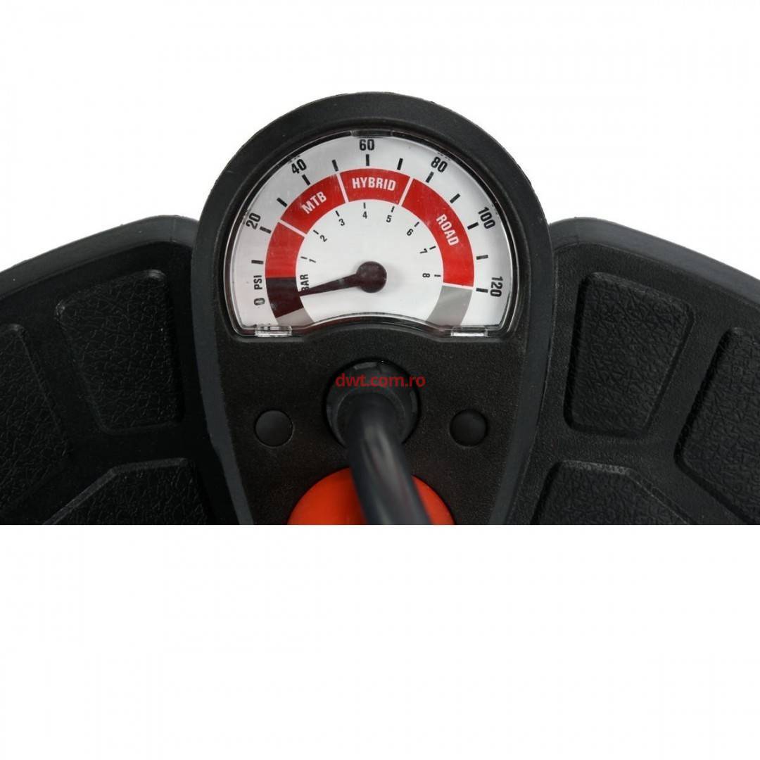 Echipata cu un manometru analog. Are un cap universal pentru umflat roti de