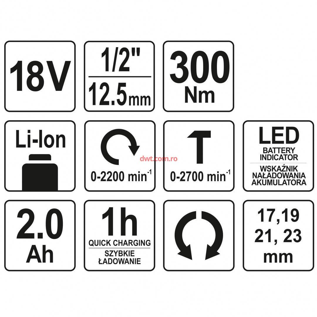 Comanda instant - YATO YT-82804 Pistol de impact cu acumulator Yato YT-82804, cuplu 300Nm, 18V, Li-Ion, 2Ah