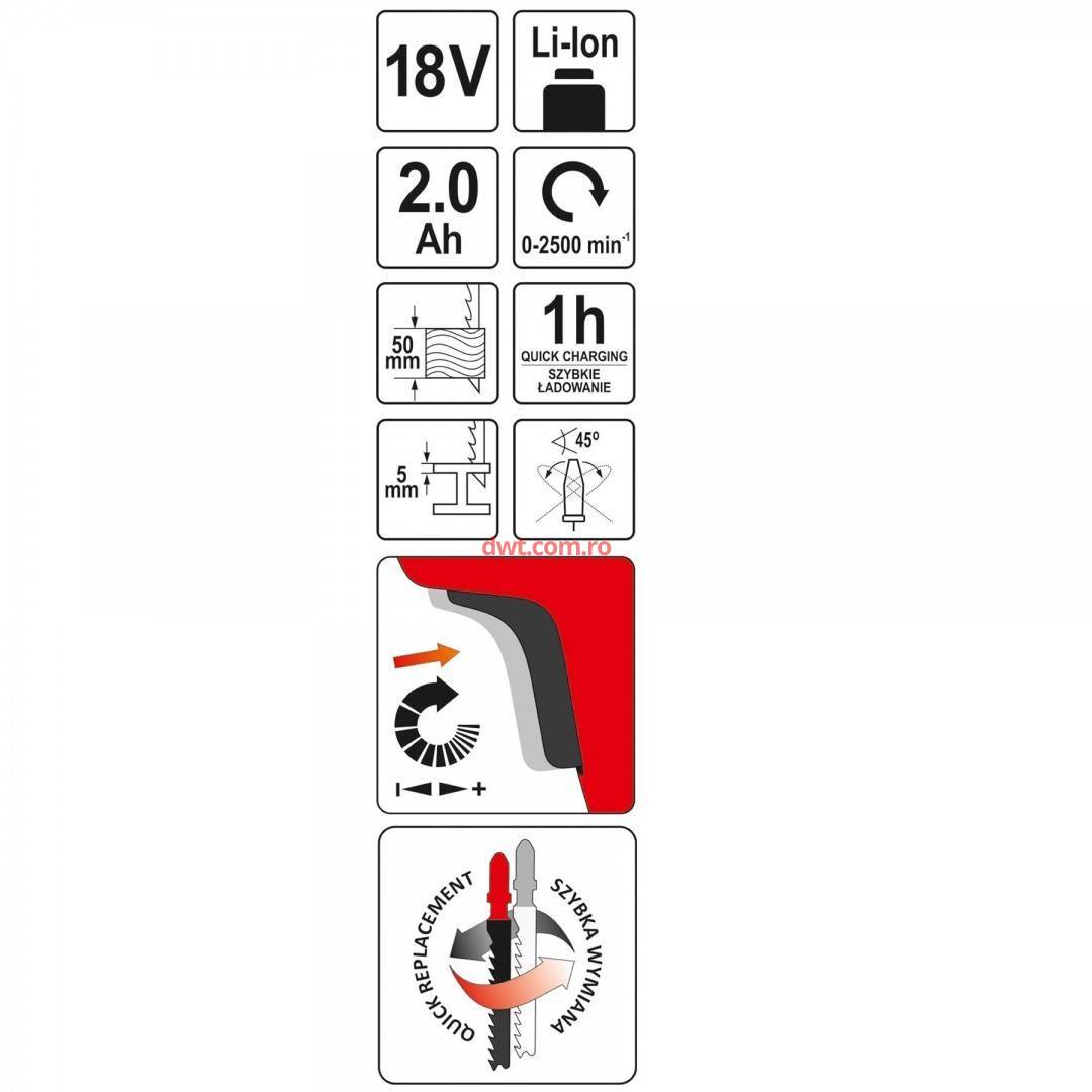 YATO YT-82822 Fierastrau pendular cu acumulator Yato YT-82822, 18V, Li-Ion, 2Ah, 0-2500rpm |